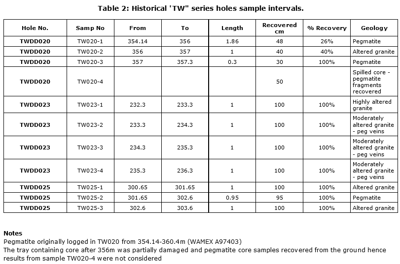 - A review of historic core from Trough Well (8km south of Ennuin North), confirms fractionated pegmatites.