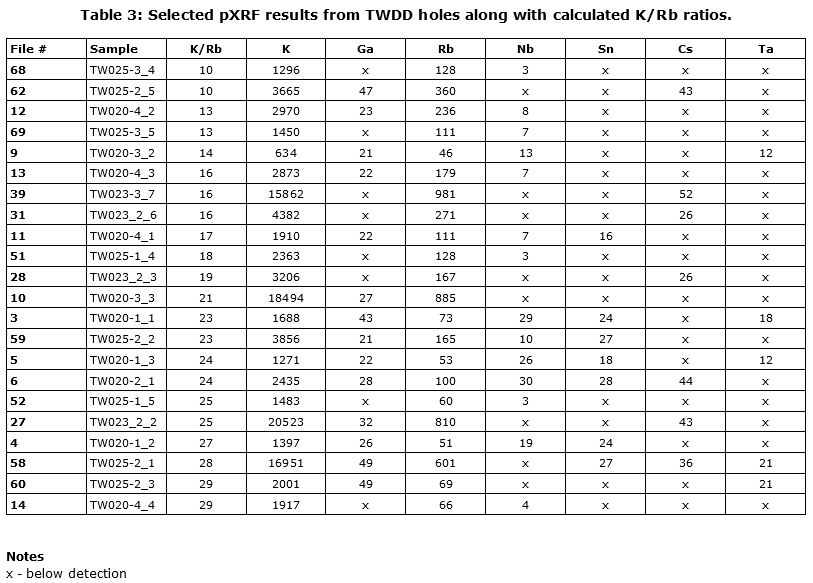 Hence the data represent a series of point data - not an average content for any lithium or other elements or in minerals present (e.g. spodumene). The selective calculated K/Rb ratios, with values <30, along with the key LCT pegmatite associated elements are shown in Table 3 with all pXRF data shown in Appendix 3. Limitations in pXRF analysis mean elements with low atomic weights (e.g. lithium and beryllium) cannot be measured with this technology.