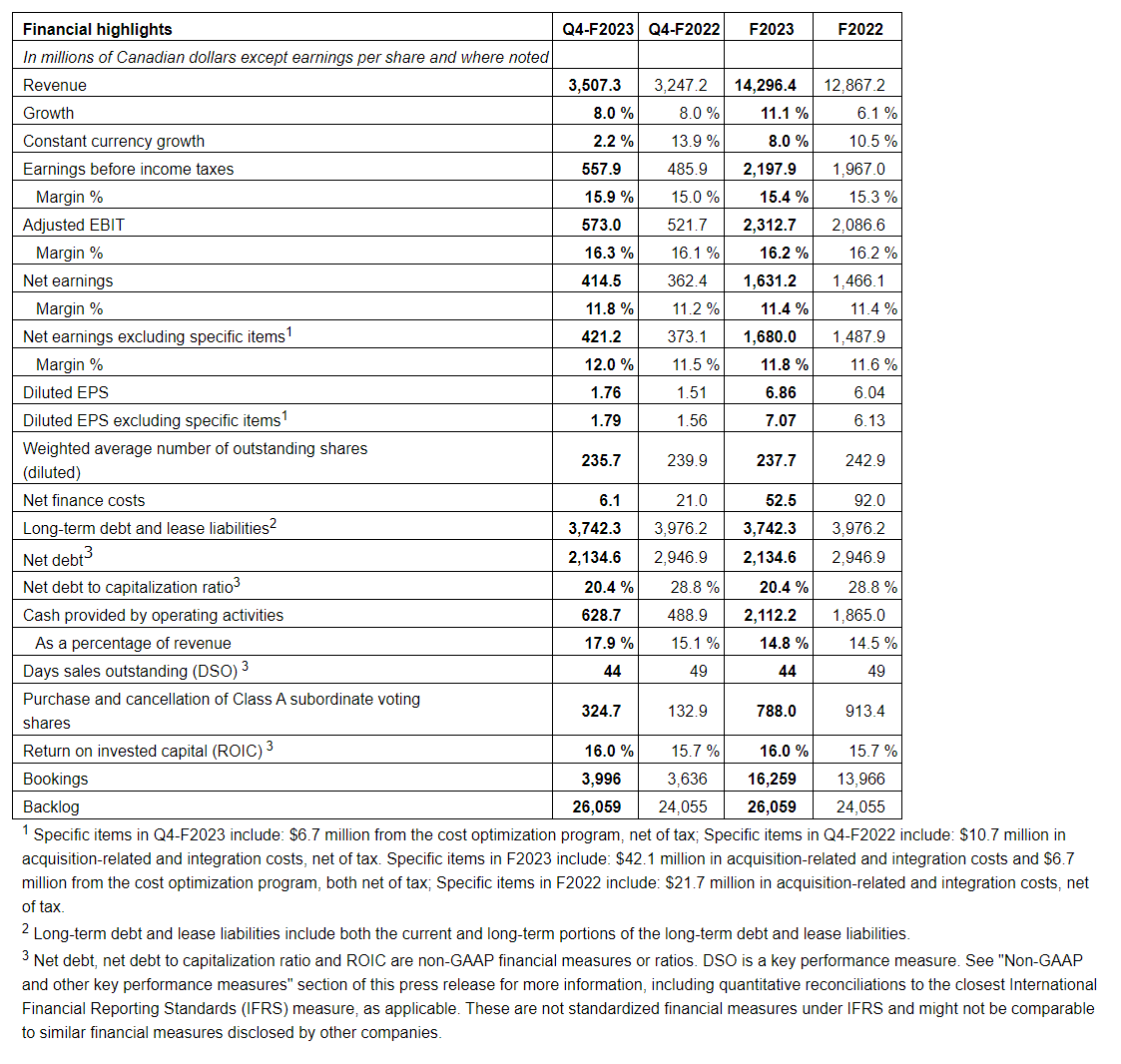 During fiscal 2023, the company invested $409.1-million back into its business and $788.0-million under its current normal course issuer bid to purchase for cancellation 6,234,096 of its Class A subordinate voting shares.