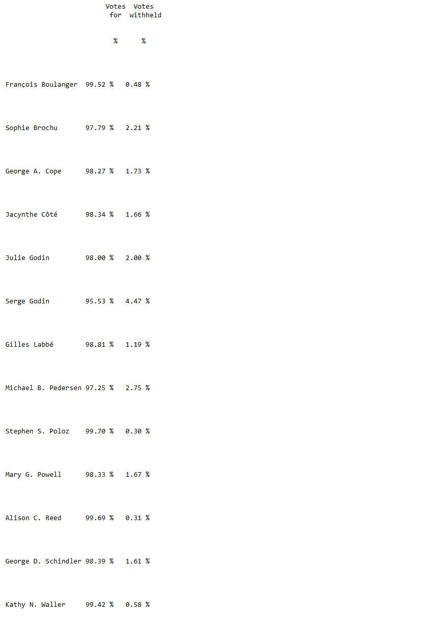 All 13 directors proposed for election at the meeting were elected by shareholders on a vote by electronic ballot. The ballots cast and proxies received by CGI for the election of directors were as shown in the attached table.