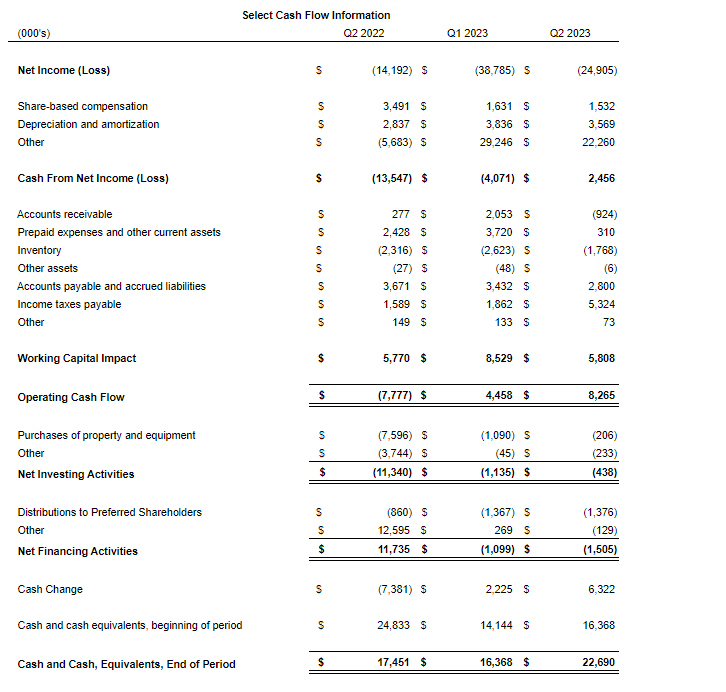 The company generated $8.3-million of cash from operations in Q2 2023 versus cash generated from operations of $4.5-million in Q1 2023 and cash usage of $7.8-million in Q2 2022. In Q2, cash impact from net income turned positive for the first time, reaching $2.5-million from negative $4.1-million in Q1. Cash flow also benefited by $5.3-million because there was no income tax paid in the quarter.