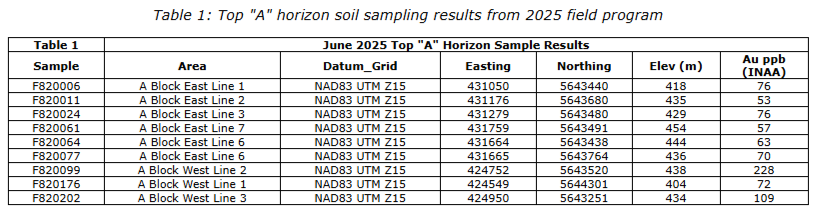 Soil and rock samples were collected, documented and photographed in the field and then placed in sealed bags and delivered to Activation Laboratories (ActLabs) in Thunder Bay, an ISO/IEC 17025-accredited laboratory. Soil sample collection is subject to Emerald Geological Services' internal QA/QC protocols, which include the insertion of blank material and certified reference material into each batch of samples submitted. Rock samples referenced in this news release were analyzed using ActLabs methods 1A2-50, a 50-gram fire assay with atomic absorption finish, and 1F2, a total digestion with ICP-OES finish for trace elements. A-horizon soil samples were analyzed using ActLabs methods 2A, an INAA (instrumental neutron activation analysis) for gold and trace elements, as well as ActLabs method 2C1, an aqua regia partial digestion with ICP finish for select metals.