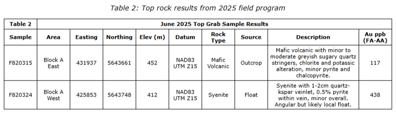 Additionally, a historical sample near the west shore of Tack Lake was revisited. This sample consisted of syenitic rock with quartz veining in local float. A sample of the boulder returned 438 ppb Au, whereas the original sample reportedly returned 178 ppb Au according to the Ontario assessment file database (see Table 2). The gold-bearing veinlets in this location might be explained as a peripheral offshoot of a geological structure underlying the valley west of Tack Lake.
