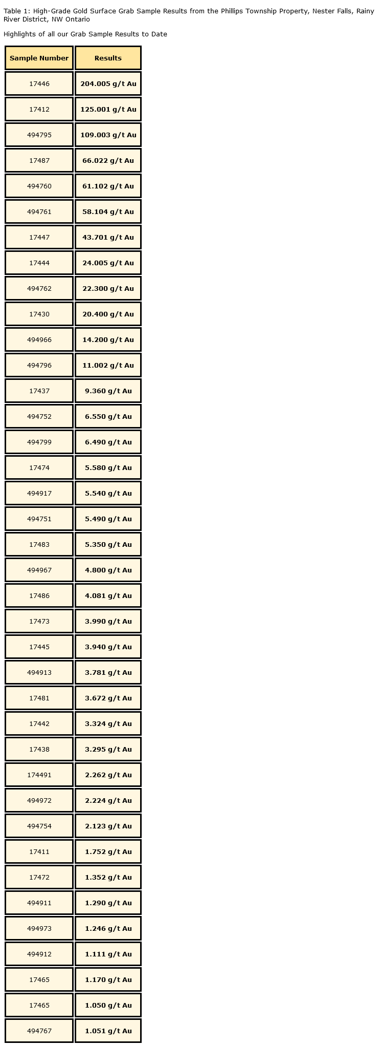 Golden Rapture Mining Corp. has released very successful initial surface sampling results from its 100-per-cent-owned Phillips township property