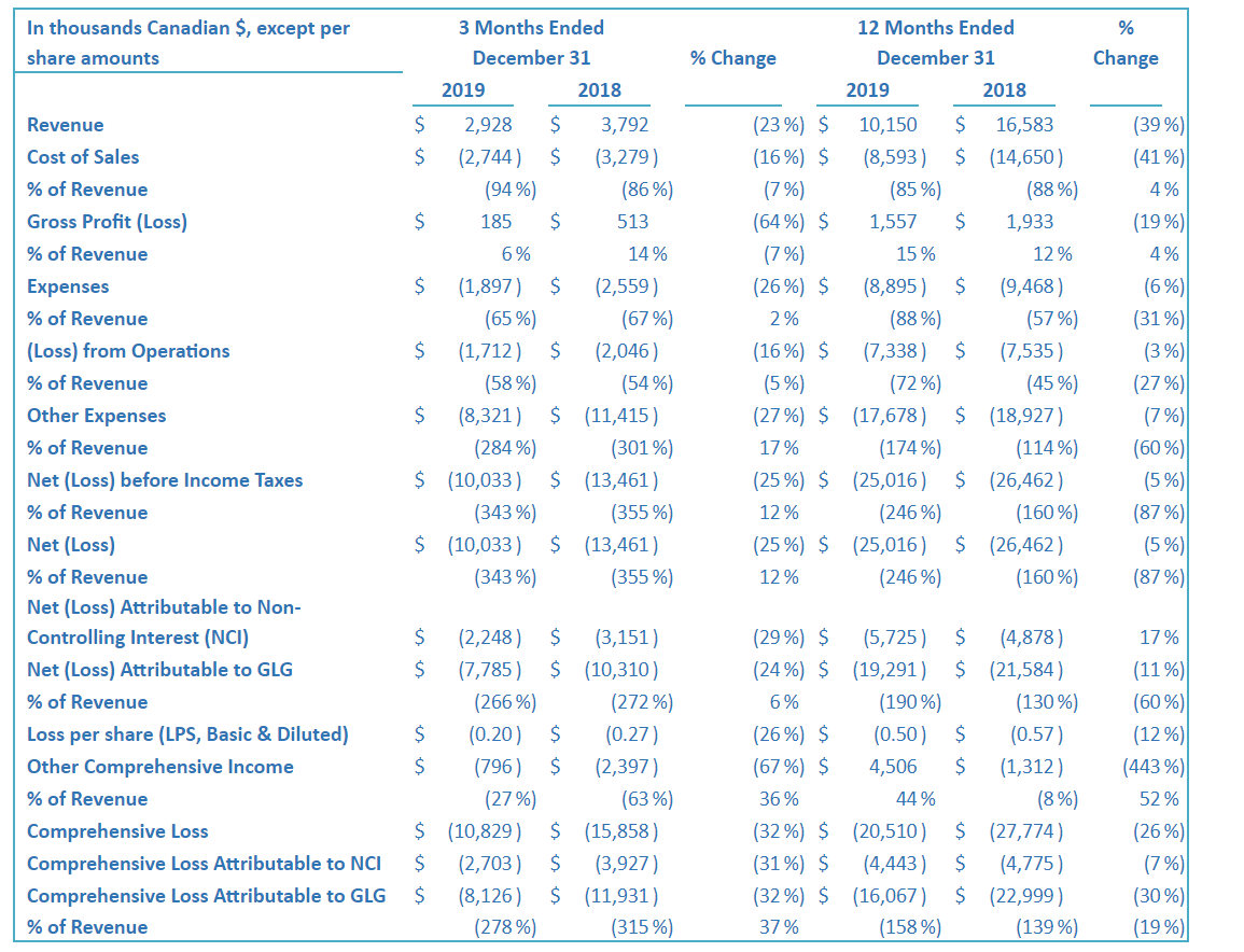 GLG LIFE TECH CORPORATION REPORTS 2019 ANNUAL AND FOURTH QUARTER FINANCIAL RESULTS