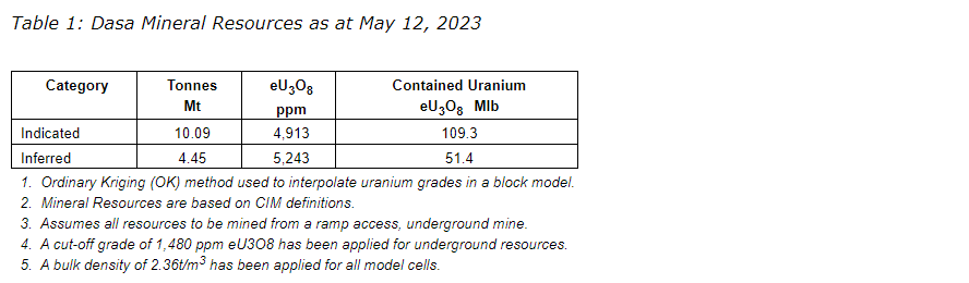 "The company intends to update the Dasa mine plan and feasibility study by the end of this year, using the new MRE, as well as actual costs for mining and capital costs for the processing plant. As the current feasibility study is based on a $35 (U.S.)/lb [pound] uranium sale price and spot prices are now above $50 (U.S.)/lb, there will be an opportunity to lower the cut-off grade, increase the minable reserves and improve Dasa project economics."