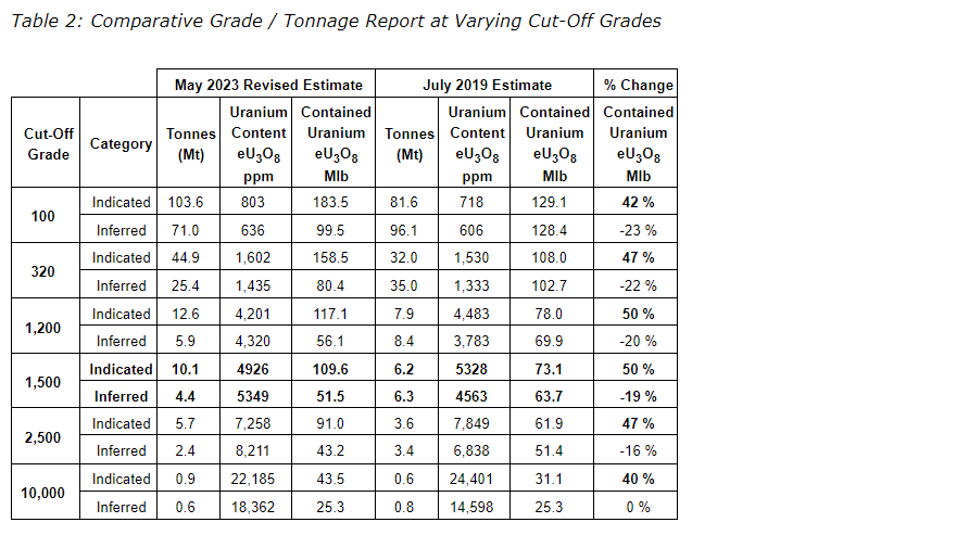 In the table entitled "Comparative grade/tonnage report at varying cut-off grades," the indicated resource using a cut-off grade of 1,500 parts per million (ppm) eU3O8 (radiometric equivalent U3O8) has increased by 50 per cent, showing an excellent conversion factor from inferred.