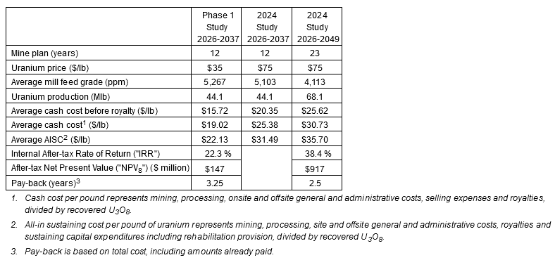The economic analysis for the 2024 Study was done with a discounted cash flow ("DCF") model based on a uranium price of $75 per pound U3O8. Sensitivity analysis was applied at intervals from $60 per pound to $105 per pound, as shown in Table 4 below.