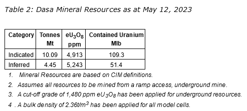 The 2024 Study has extended the Dasa Mine Life from 12 to 23 years, Mineral Reserves have increased by 50 per cent to 73 million pounds U3O8, and uranium production from Dasa has increased by 55 per cent to 68.1 million pounds.