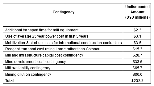 Reagent costs for the mill are assumed to be transported through the Togo - Burkina Faso rather than the traditional route via the port of Cotonou in Benin.