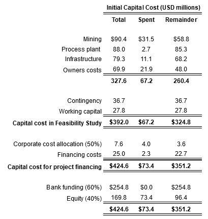 Initial capital costs include a general contingency provision of 12 per cent for the mill and infrastructure.