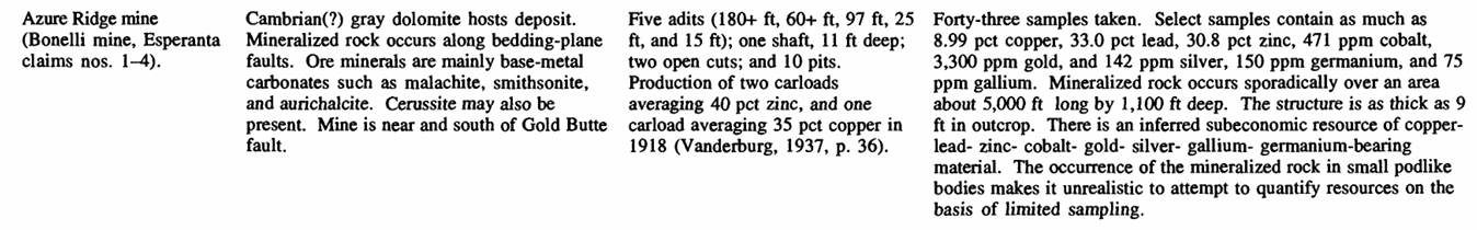 “Forty-three samples taken. Select samples contain as much as 8.99 % copper, 33.0 % lead, 30.8 pet zinc, 471 ppm cobalt, 3,300 ppm gold, and 142 ppm silver, 150 ppm germanium, and 75 ppm gallium. Mineralized rock occurs sporadically over an area about 5,000 ft long by 1,100 ft deep. The structure is as thick as 9 ft in outcrop. There is an inferred subeconomic resource of copper- lead- zinc- cobalt- gold- silver- gallium- germanium-bearing material. The occurrence of the mineralized rock in small pod-like bodies makes it unrealistic to attempt to quantify resources on the basis of limited sampling. 3 ”
