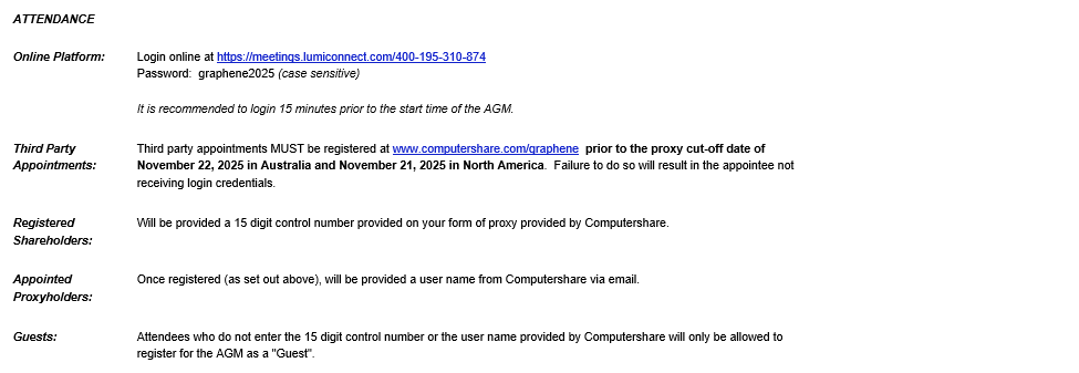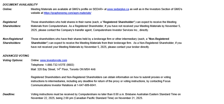 Graphene Manufacturing Group Ltd. has filed its notice of annual general meeting (AGM) of shareholders and management information circular. The company will hold the meeting on Wednesday, Nov. 26, 2025, at 8 a.m. Brisbane AEST, being Tuesday, Nov. 25, 2025, at 2 p.m. Canadian PST.
