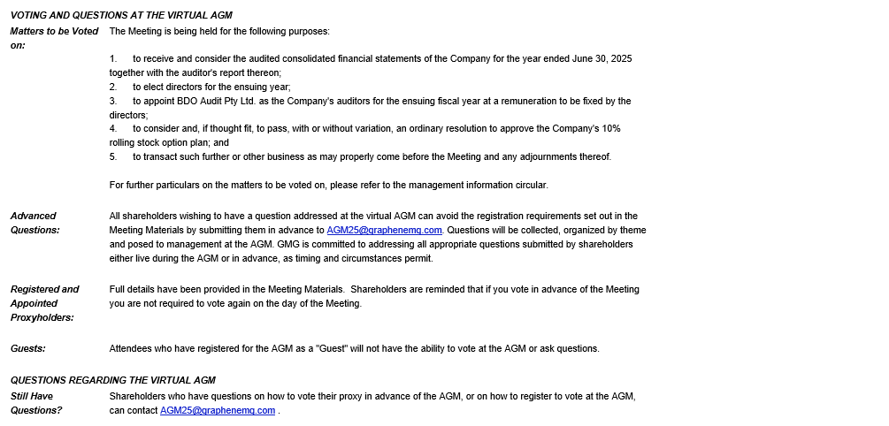 GRAPHENE MANUFACTURING GROUP LTD. PROVIDES DETAILS OF 2025 ANNUAL GENERAL MEETING TO BE HELD VIRTUALLY