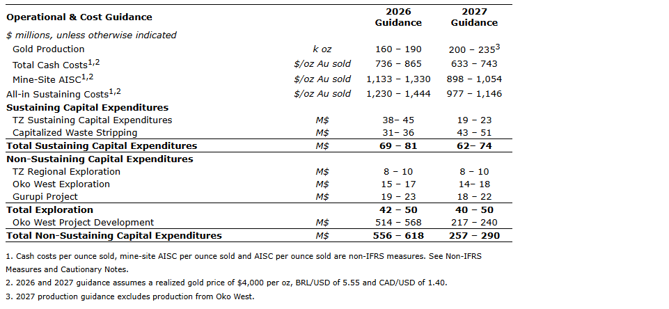 Two thousand twenty-six is set to be the largest exploration program in the corporation's history with a budget between $42-million and $50-million, including approximately $21-million at Gurupi, $16-million at Oko West and $9-million at TZ. A comparable level of investment is planned for 2027.