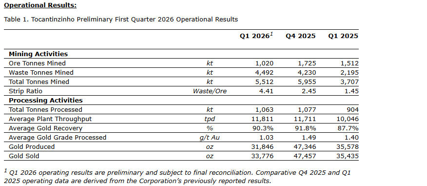 G Mining Ventures Corp. has released its preliminary production results for the quarter ended March 31, 2026, from its 100-per-cent-owned Tocantinzinho gold mine (TZ) in Para state, Brazil. Results were in line with the corporation's expectations.