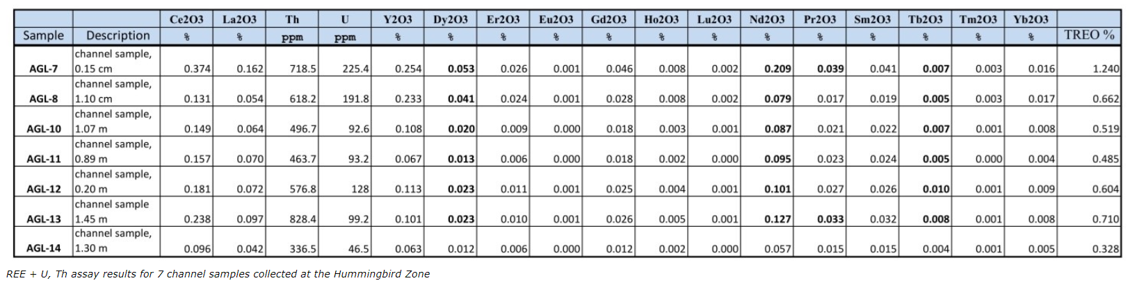 All seven channel samples collected from the Hummingbird structure returned high grades of light (LREE) and heavy (HREE) rare-earth elements plus or minus thorium and uranium. Total rare-earth oxide contents (TREO) vary between 0.328 per cent and 1.24 per cent. Uranium could represent a byproduct of the REE mineralization; higher grades below the oxidation level can be expected.