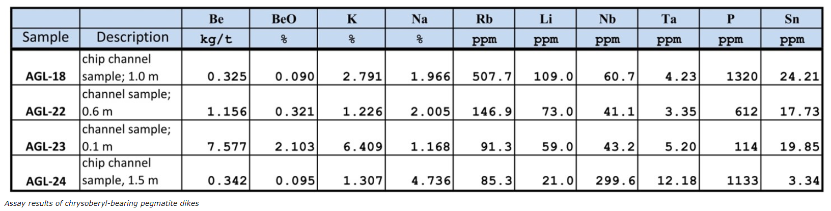 Pegmatites, up to six m thick, highly enriched in beryllium occur within the Globex claim block over a strike length of about 2.5 km. Be pegmatites are composed of feldspar (microcline, albite, plagioclase), muscovite, locally garnet, in places minor tourmaline, beryl and/or chrysoberyl. In addition to beryllium these pegmatites carry locally also minor amounts of the critical metals niobium and tantalum. In the 1950s and 1960s BeO grades had been analyzed from 135 rock samples (bulk, channel and grab), grades ranged widely between 0.02 per cent and 2.98 per cent, corresponding to Be values between 0.072 and 10.736 kilogram per tonne. Globex collected four samples from these pegmatites, they returned between 0.325 and 7.577 kg/t beryllium.