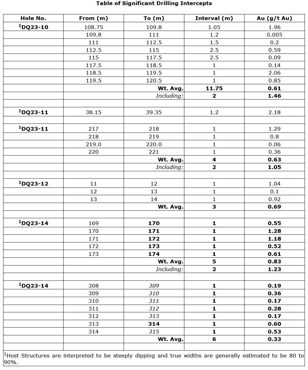 DQ23-10 intersects 11.75 meters (m) of 0.61 g/t Au