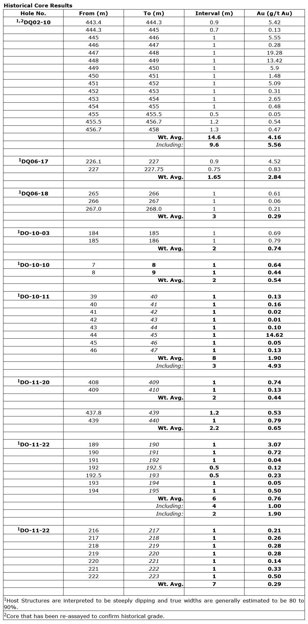 Drillholes 2DQ06-17 and DQ06-18 which are 1.7 km from the main Phase 1, Open Pit area contain unsampled mineralization (see table 1) where higher grade gold exists in historical core. In addition to these incremental ounces, both these drill-holes have near surface, higher grade intercepts. 2DQ06-17 had an interval of 4.6 m of 2.56 g/t Au and 2DQ06-18 had an interval of 2.5 m of 51.9 g/t Au.