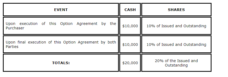 The company also entered into an option agreement, as of the date of this news release, with an arm's-length party (the purchaser). Pursuant to the option agreement, the company is the registered and beneficial holder of 100 per cent of the right, title and interest in and to the Lacana-Doran property. The option agreement provides that the purchaser the option to acquire, from the company, up to a 100-per-cent interest in the property on the indicated dates shown in the attached table.