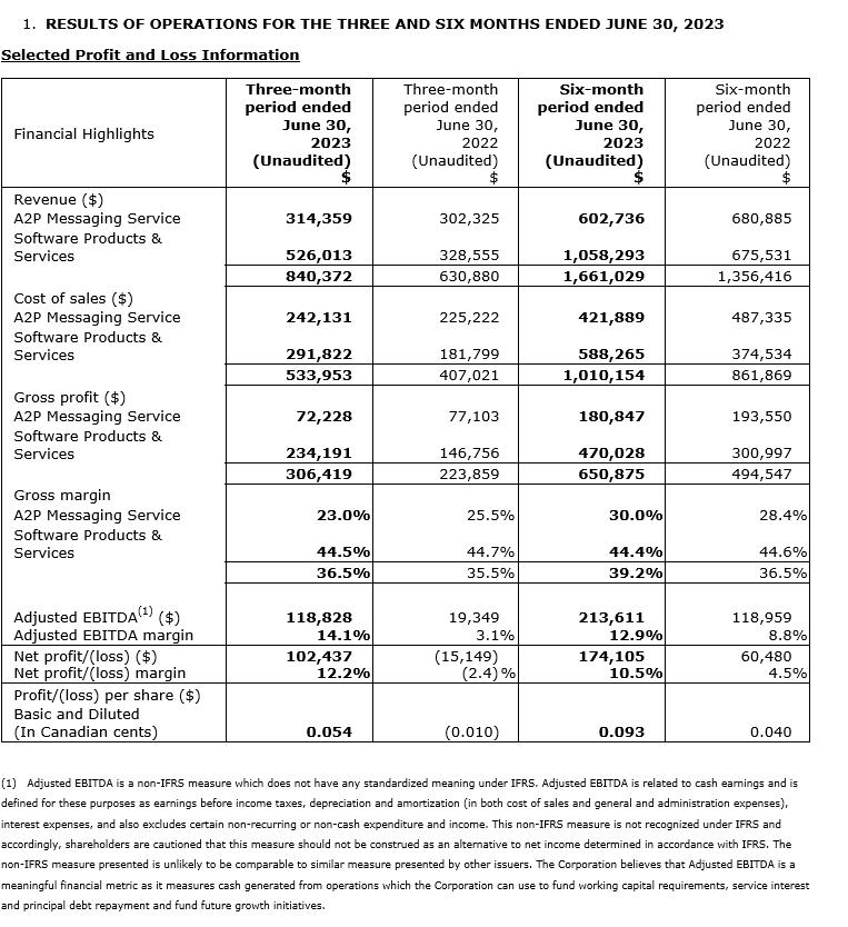 The complete financial results for GINSMS are available on SEDAR. Highlights include: