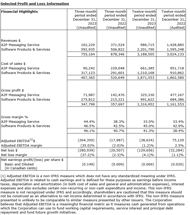 The annual audited financial statements of the corporation for the 12 months ended Dec. 31, 2023, are currently under audit and in the process of preparation. As required under Canadian securities law regulations, the corporation will be disclosing and filing on SEDAR+ its annual audited financial statements and the related management's discussion and analysis (MD&A) within 120 days after the end of its year-end of Dec. 31, 2023.