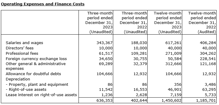 - Operating expenses and finance costs of $1,450,602 for the 12-month period ended Dec. 31, 2023, increased from $1,185,701 for the 12-month period ended Dec. 31, 2022;