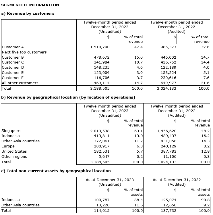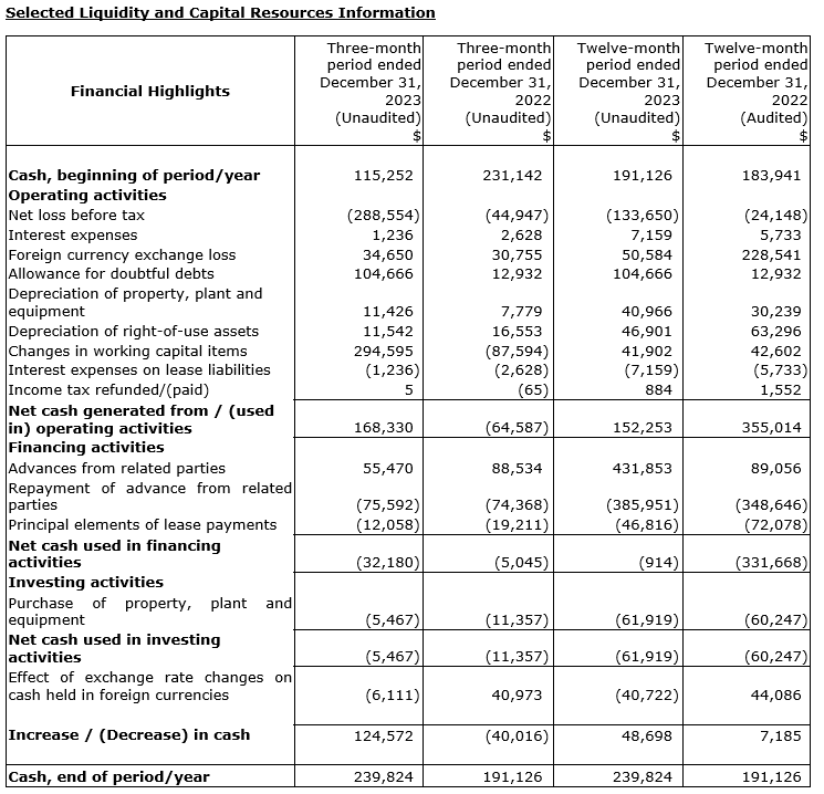 Total assets of GINSMS, including cash, accounts receivable, deposits and prepayment, current tax asset, property, plant and equipment, and right-of-use assets, as at Dec. 31, 2023, amounted to $1,053,176, compared with $947,927 as at Dec. 31, 2022. Bank and cash balances amounted to $239,824 as at Dec. 31, 2023, an increase of 25.5 per cent compared with $191,126 as at Dec. 31, 2022. The increase was mainly due to more net cash inflow from operating activities during the year.