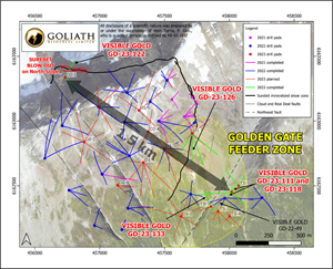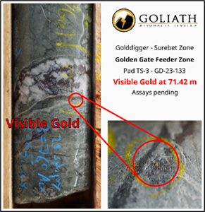TORONTO, July 12, 2023 (GLOBE NEWSWIRE) -- Goliath Resources Limited (TSX-V: GOT) (OTCQB: GOTRF) (FSE: B4IF) (the “Company” or “Goliath”) is pleased to report it has drilled visible gold and 12.47 meters* of highly mineralized quartz-sulphide-rich breccia from hole GD-23-133 within the Surebet Golden Gate Feeder Zone at its 100 % controlled Golddigger property (the “Property”), Golden Triangle, British Columbia. This intercept is interpreted to be a splay from the Bonanza Shear that remains open. Visible gold has been reported from a total of six holes drilled to date within the Surebet Golden Gate Feeder Zone, inclusive of: GD-22-49, GD-22-58, GD-23-111, GD-23-118, GD-23-126 and GD-23-133.