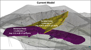 - ~1 mm nugget of Visible Gold was intercepted at 71.42 meters in a mineralized quartz-sulphide-rich breccia interpreted to be a splay from the Bonanza Shear within the Surebet Golden Gate Feeder Zone (see images below).
