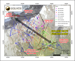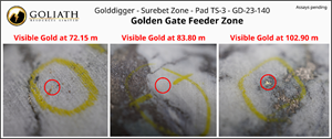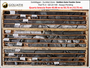TORONTO, July 17, 2023 (GLOBE NEWSWIRE) -- Goliath Resources Limited (TSX-V: GOT) (OTCQB: GOTRF) (FSE: B4IF) (the “Company” or “Goliath”) is pleased to report it has drilled three occurrences ofVisible Gold and 12.73 meters* of mineralized quartz-sulphide-rich breccia from hole GD-23-140 within the Surebet Golden Gate Feeder Zone at its 100 % controlled Golddigger property (the “Property”), Golden Triangle, British Columbia. This intercept is interpreted to be the Bonanza Shear that remains open. Eight holes drilled to date within the Surebet Golden Gate Feeder Zone have encountered visible gold and reported from holes: GD-22-49, GD-22-58, GD-23-111, GD-23-118, GD-23-126, GD-23-133, GD-23-137 and GD-23-140.