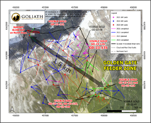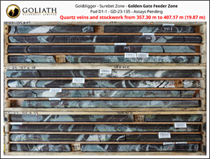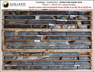 TORONTO, July 24, 2023 (GLOBE NEWSWIRE) -- Goliath Resources Limited (TSX-V: GOT) (OTCQB: GOTRF) (FSE: B4IF) (the “Company” or “Goliath”) is pleased to report it has drilled a second hole from Cliff Pad that contains Visible Gold as well as two separate intervals of significant mineralization at GD-23-135 within the Surebet Golden Gate Feeder Zone at its 100 % controlled Golddigger property (the “Property”), Golden Triangle, British Columbia. This intercept is interpreted to be the Bonanza Shear that remains open. Nine holes drilled to date within the Surebet Golden Gate Feeder Zone have encountered visible gold: GD-22-49, GD-22-58, GD-23-111, GD-23-118, GD-23-126, GD-23-133, GD-23-135, GD-23-137 and GD-23-140.