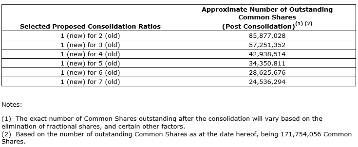 The board is recommending that shareholders approve the consolidation proposal at the meeting. The company is not expected to change its name or trading symbol in conjunction with the consolidation proposal. All outstanding convertible securities such as stock options, restricted share units and warrants will also be affected by the consolidation proposal, if approved.