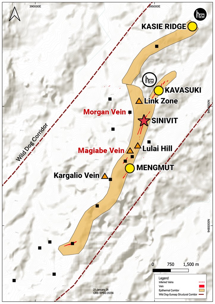 These earlier results demonstrated the presence of high-grade polymetallic epithermal mineralization hosted within steeply dipping quartz-sulphide veins located approximately 700 metres southwest of the Sinivit Deposit within the Wild Dog Structural Corridor (Figure 2).