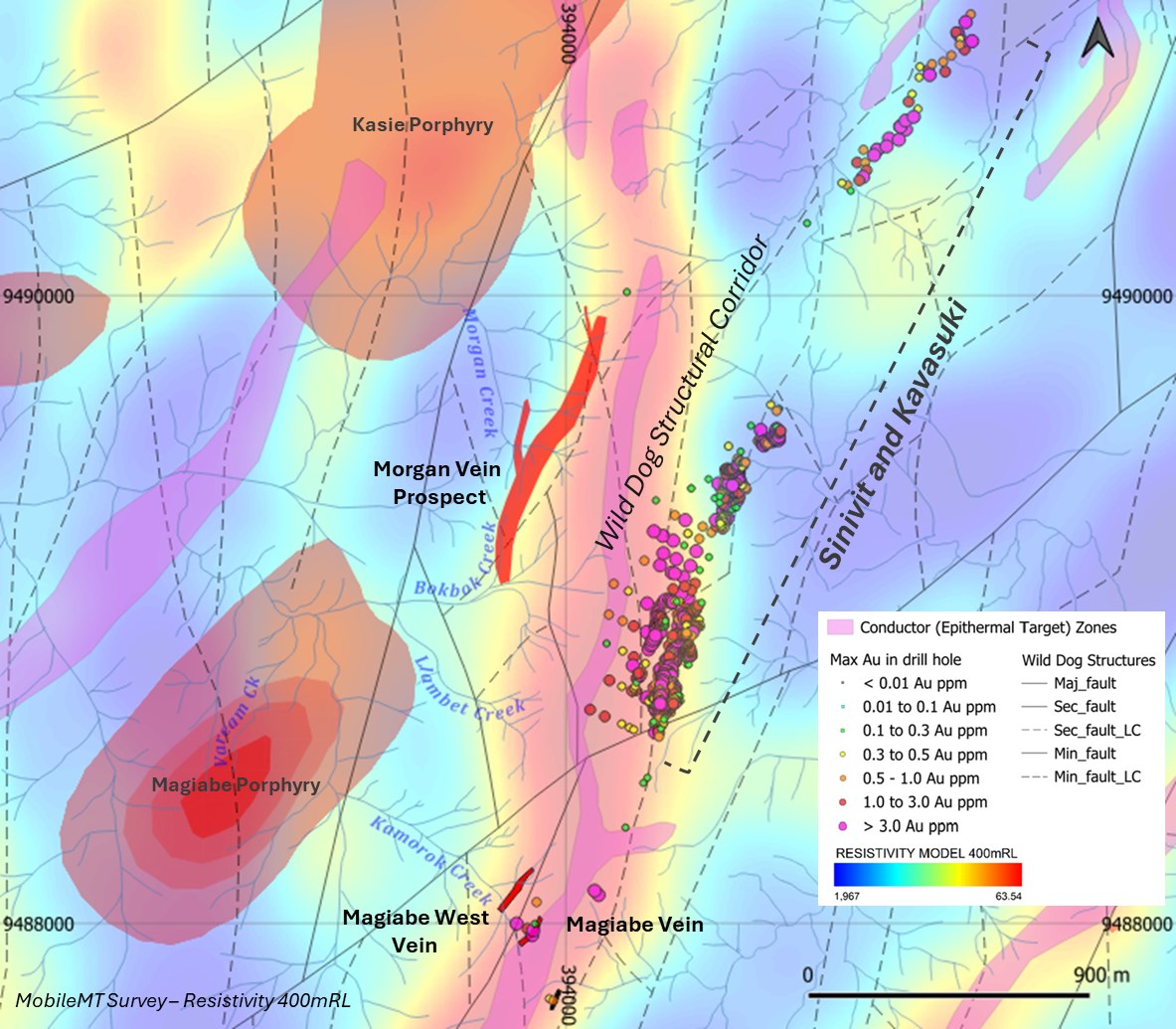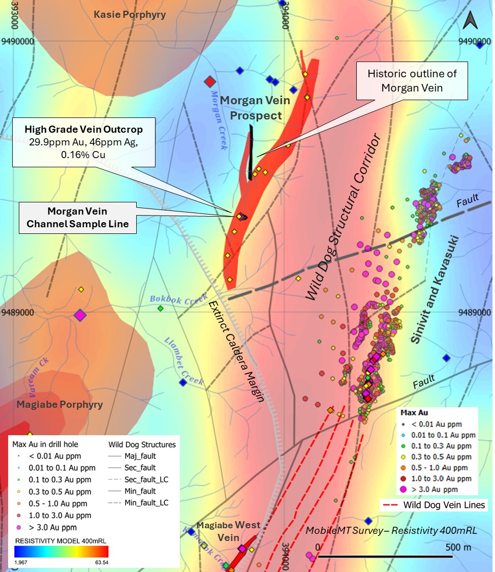 Figure 2: Plan map of the Magiabe and Morgan Vein prospects along the Wild Dog Structural Corridor, showing surface geochemical results, mapped and inferred vein extensions, and their relationship to Sinivit and Kavasuki.