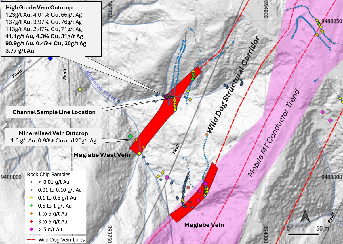 Figure 3: Plan map of the Magiabe and Magiabe West vein systems showing rock-chip sample locations, interpreted vein trends and associated fault structures within the Wild Dog Structural Corridor.
