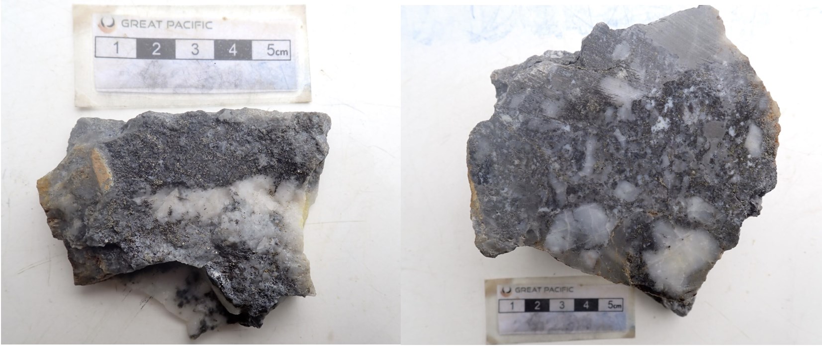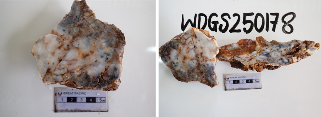 Figure 7: Rock-chip sample WDGS250178 from the Morgan Vein Prospect showing moderately oxidized vein material comprising milky white and grey sulphidic quartz with limonitic iron oxide staining localised along vein margins and fracture surfaces. The sample returned 29.9 g/t Au, 46 g/t Ag, and 0.16% Cu.