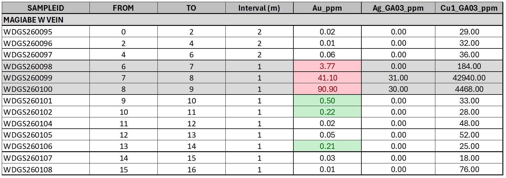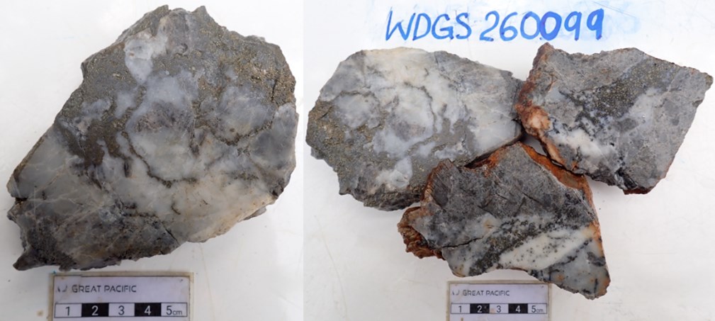 - WDGS260099: 41.1 g/t Au, 31 g/t Ag, 4.3% Cu