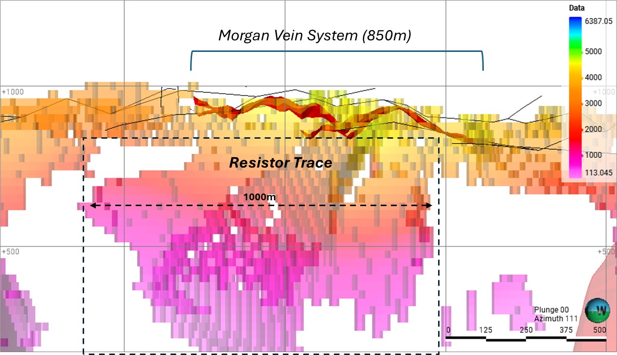 Figure 9: Strike-parallel long section of the Morgan Vein System, illustrating the spatial coincidence between the ~850 m mineralised corridor and the underlying resistivity anomaly defined by the MobileMT geophysical survey.