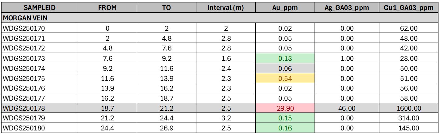 Channel sampling across the Morgan vein returned locally high-grade gold values, including 29.9 g/t Au, 46 g/t Ag and 0.16% Cu from channel sample WDGS250178 (Figure 7).