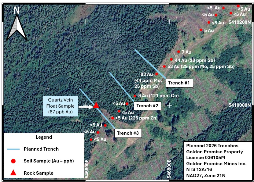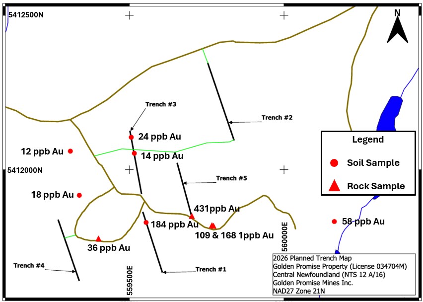 Trenching is planned within the southwest and east-central regions of the Golden Promise Property. Golden Promise has received approvals from the Newfoundland and Labrador government for the planned trenches.