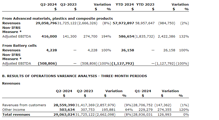 - Adjusted EBITDA of negative $508,806 in Q2 2024 compared with nil in Q2 2023 for the battery cells segment (VoltaXplore initiative);