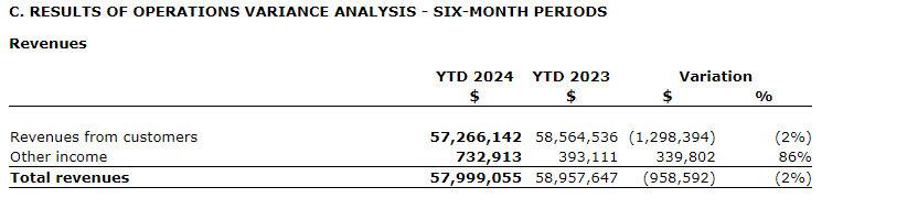 Revenues from customers decreased from $31,417,369 in Q2 2023 to $28,559,390 in Q2 2024. This decrease is mainly due to lower volume representing approximately $3-million resulting from a six-week strike at one of the company's major customers and to lower tooling revenues.