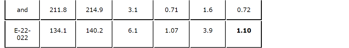 - 1.10 g/t gold equivalent over 6.1 metres, 0.96 g/t gold equivalent over 3.0 metres and 0.57 g/t gold equivalent over 6.1 metres in hole E-22-022;