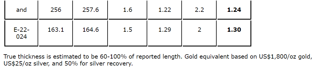 - 1.93 grams per tonne gold equivalent over 1.5 metres, 0.58 g/t gold equivalent over 7.6 metres and 1.24 g/t gold equivalent over 1.6 metres in hole E-22-023;