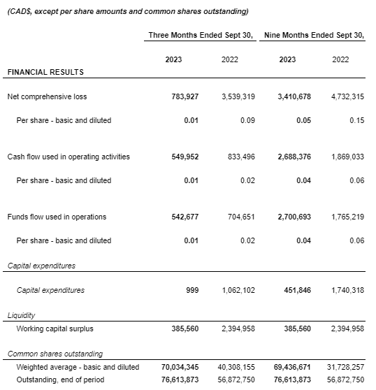 GROUNDED LITHIUM REPORTS THIRD QUARTER 2023 FINANCIAL AND OPERATING RESULTS
