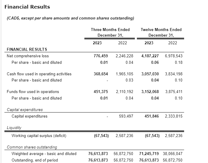 Grounded Lithium Corp. has released its financial and operating results for the three- and 12-month period ended Dec. 31, 2023. Selected financial and operational information is set out below and should be read in conjunction with the company's Dec. 31, 2023, financial statements and the related management's discussion and analysis, which are available for review on SEDAR+ or the company's website.
