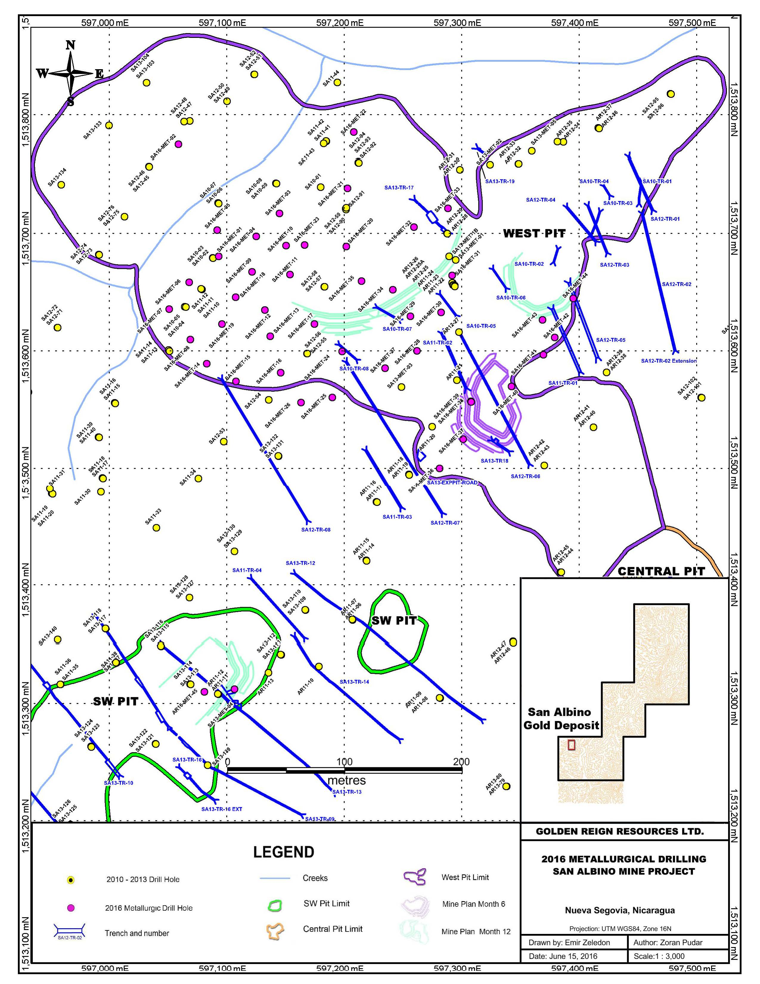 Drilling was focused at the proposed San Albino open-pit mine area. In all, 56 diamond drill holes were cored over 2,175.3 metres. A total of 44 holes targeted the San Albino prospect (West Pit), one drill hole was completed on the south slope of San Albino hill (SW Pit) and 11 holes were drilled at the Arras prospect (Central Pit) (see Figure 2) . This drill program targeted the shallow dipping, high-grade mineralized zones - starting at surface to an approximate depth of 60 metres. Golden Reign has improved the continuity and confidence of the mineralized zones.