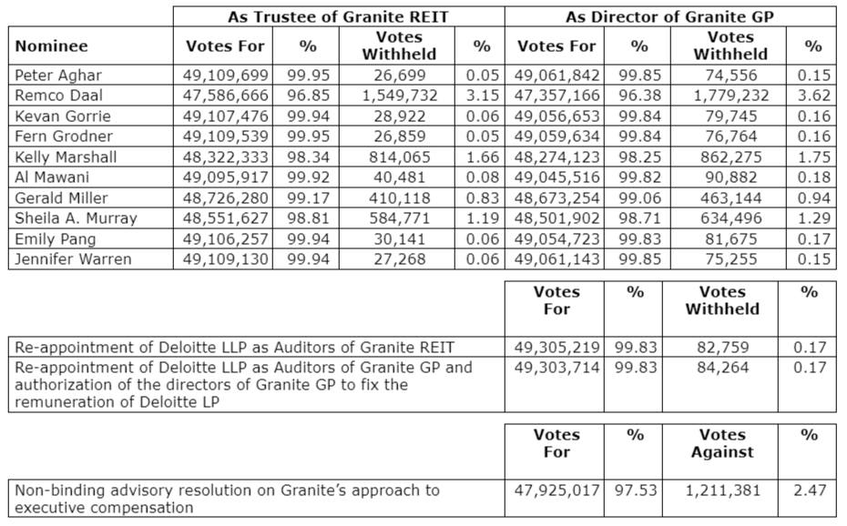 Granite Real Estate Investment Trust and Granite REIT Inc. (Granite GP) have released the results of the matters voted on at their joint annual general meetings of stapled unitholders held earlier today. Each of the individuals nominated for election as a trustee of Granite REIT and a director of Granite GP, as set out in Granite's management information circular dated April 12, 2023, were elected as set out in the associated table.